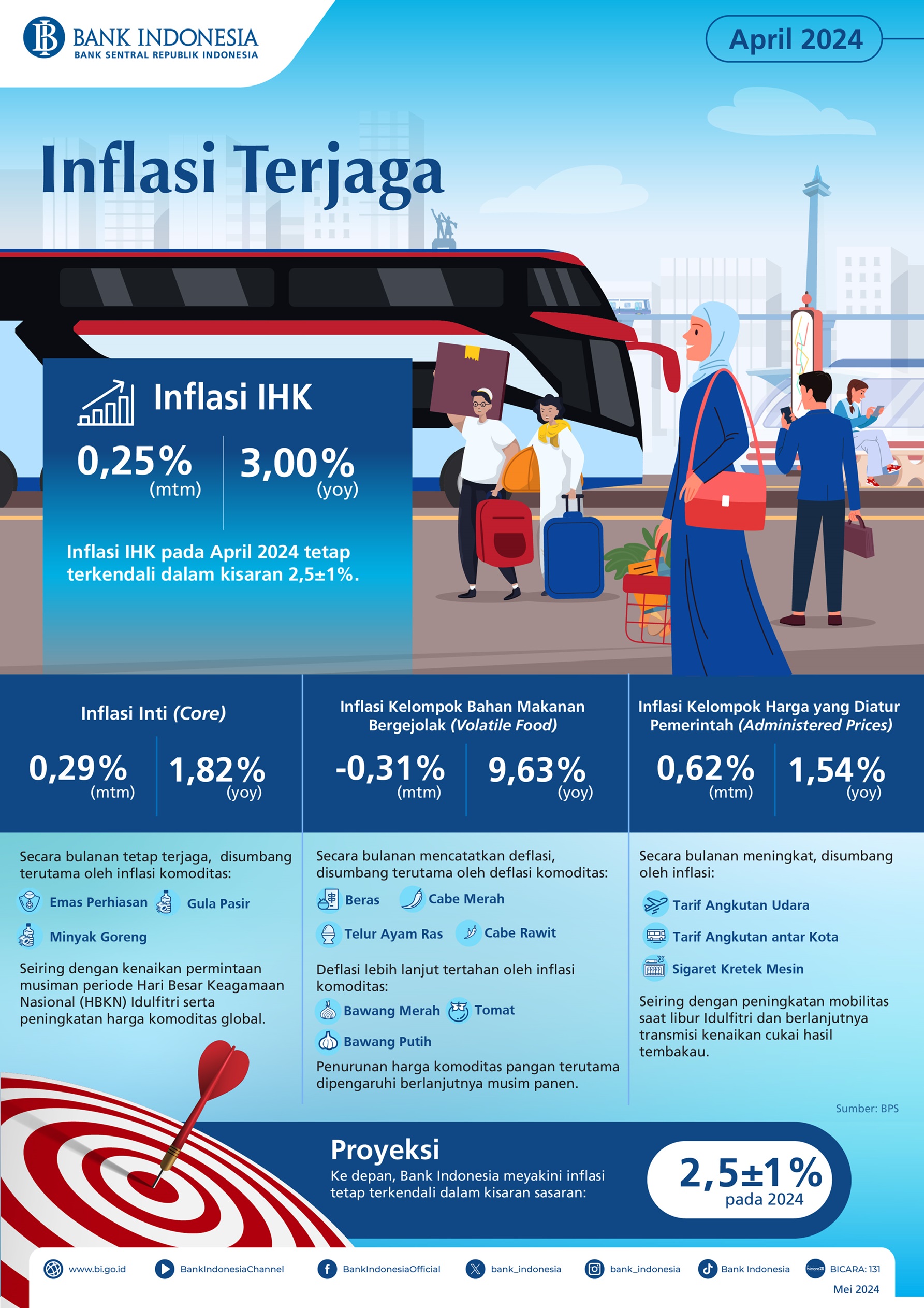 BERDASARKAN data Badan Pusat Statistik (BPS), inflasi Indeks Harga Konsumen (IHK) April 2024 tercatat sebesar 0,25% (mtm), sehingga secara tahunan menjadi 3,00% (yoy). Inflasi Indeks Harga Konsumen (IHK) pada April 2024 tetap terjaga dalam kisaran sasaran 2,5±1%.