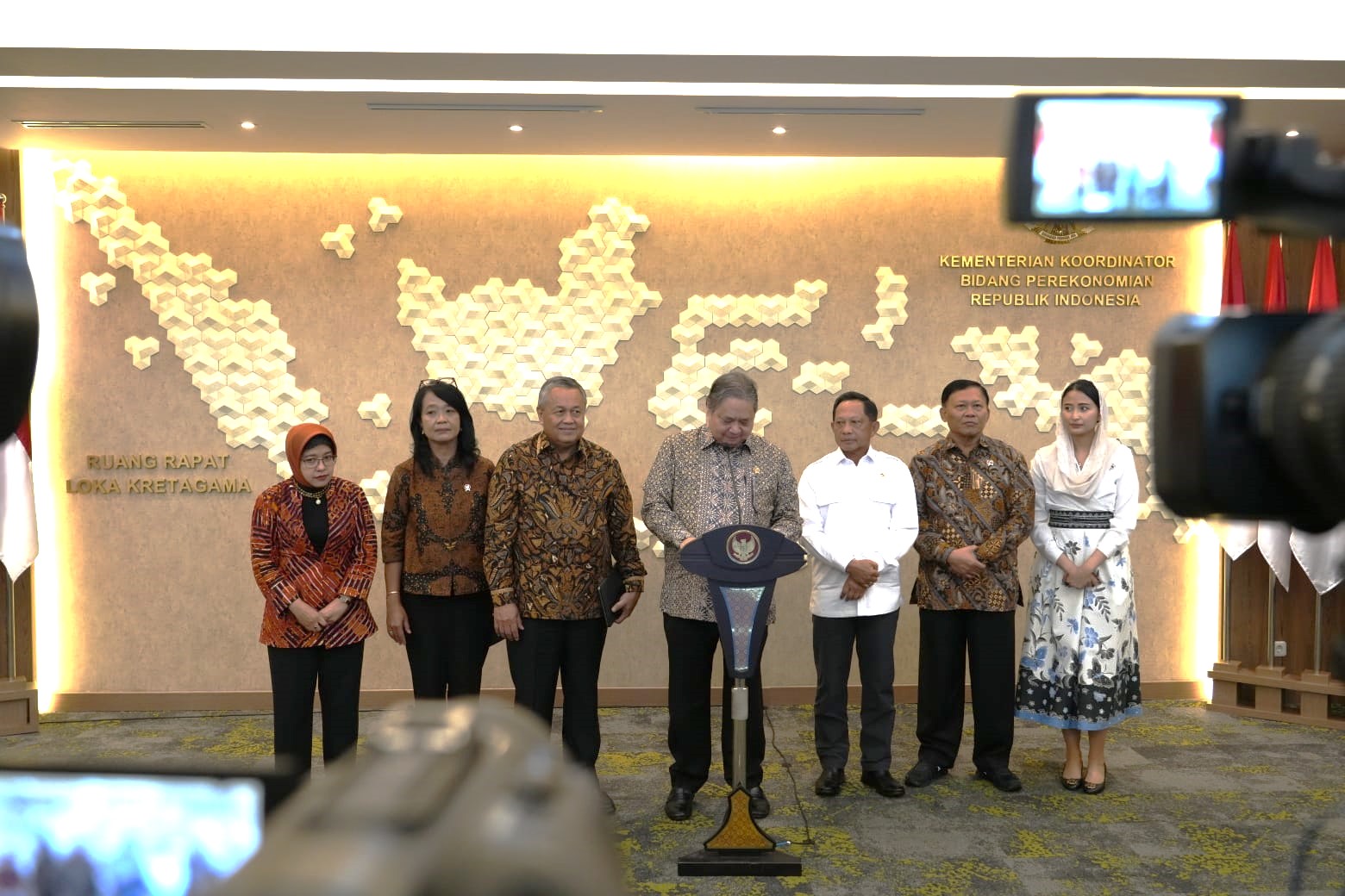 Menteri Koordinator Bidang Perekonomian Airlangga Hartarto memimpin tertemuan tersebut diikuti oleh Gubernur BI Perry Warjiyo, Menteri Keuangan Sri Mulyani, dan Menteri Dalam Negeri Tito Karnavian.