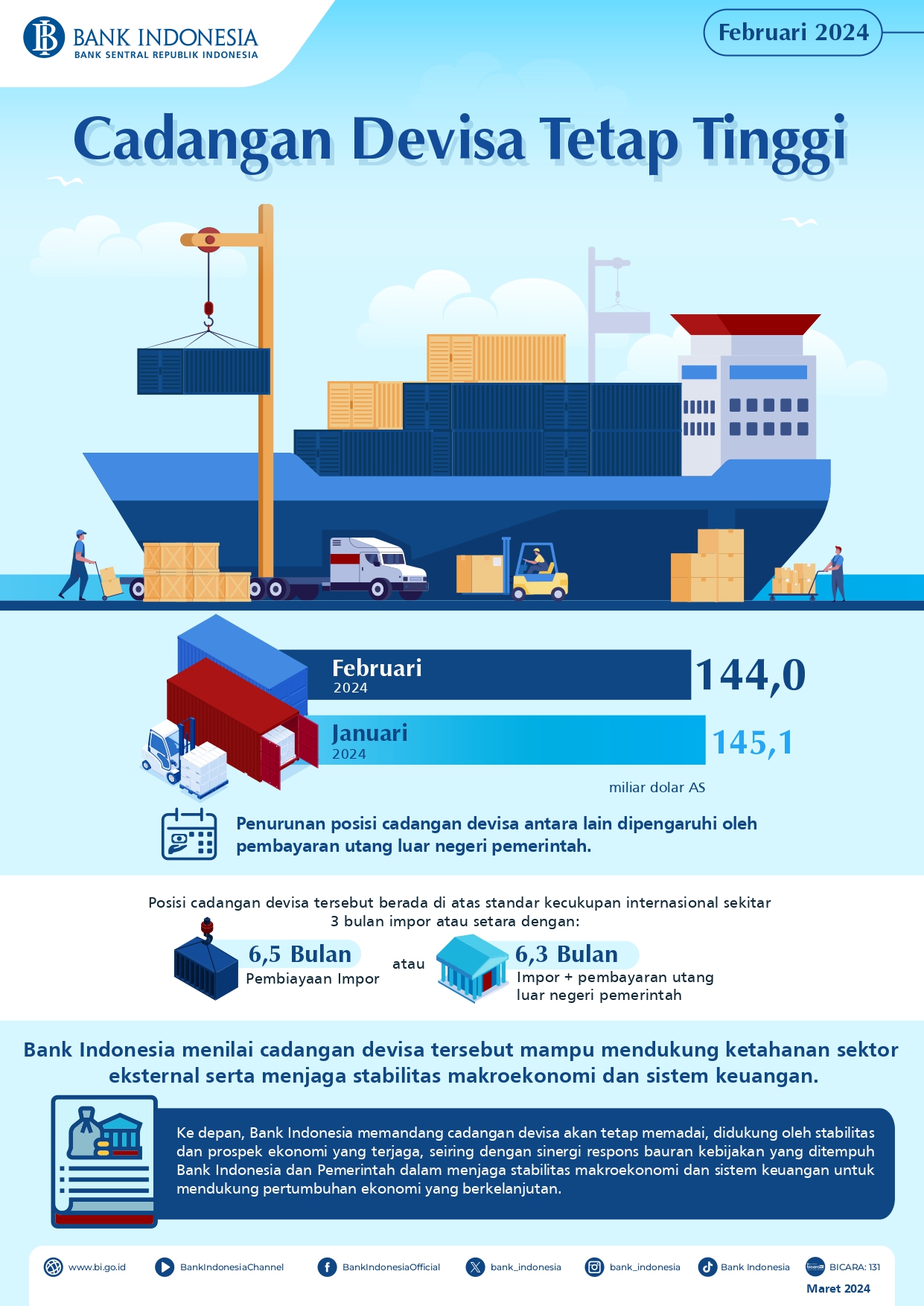 “Meski menurun dibandingkan akhir Januari 2024, posisi cadangan devisa Indonesia pada akhir Februari 2024 tetap tinggi yakni sebesar USD144,0,” ujarnya.