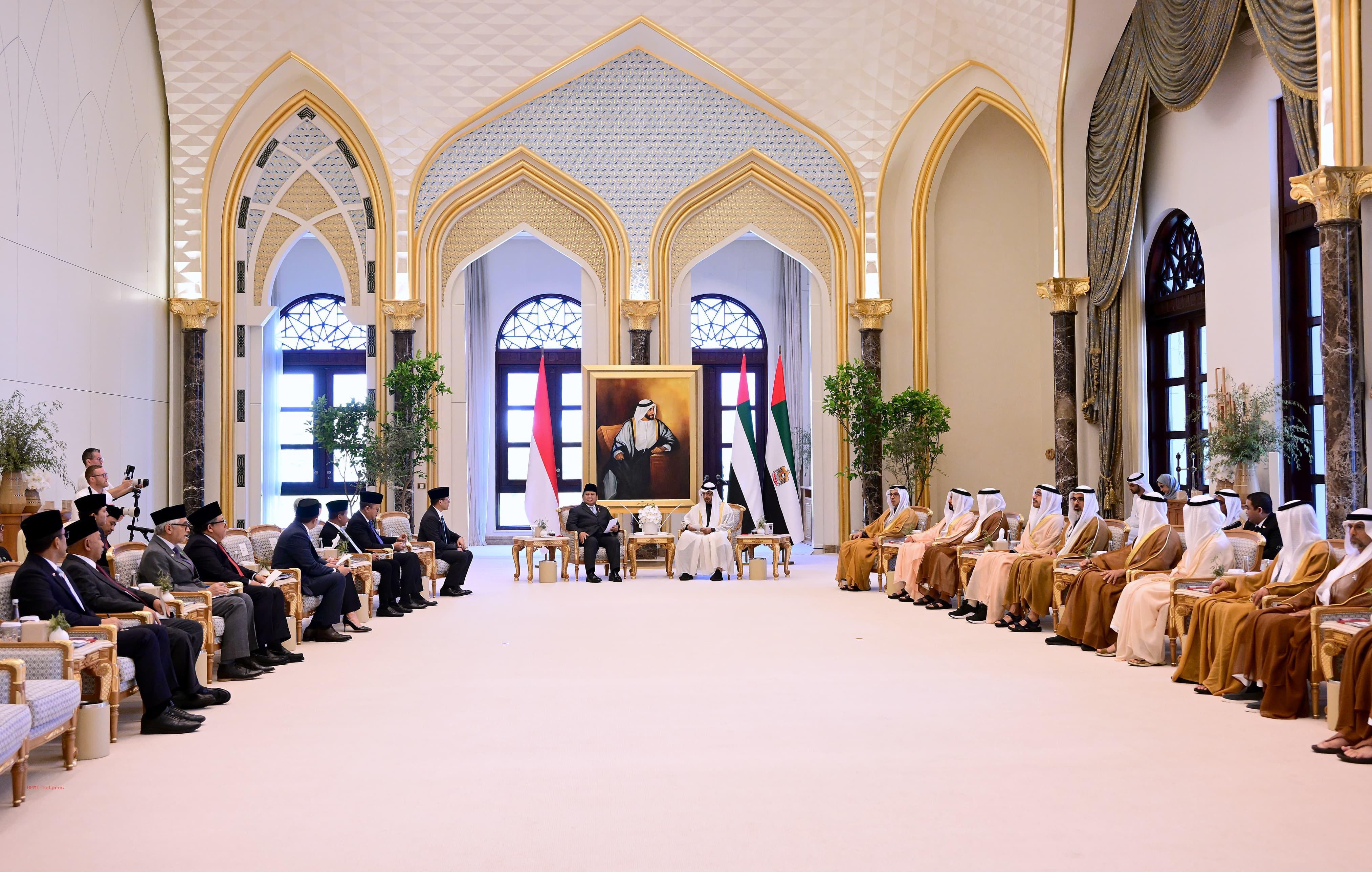 TIBA di Abu Dhabi, Presiden Prabowo Subianto melakukan pertemuan bilateral dengan Presiden Uni Emirat Arab (UEA) atau Persatuan Emirat Arab (PEA), Sheikh Mohamed bin Zayed Al Nahyan (MBZ).