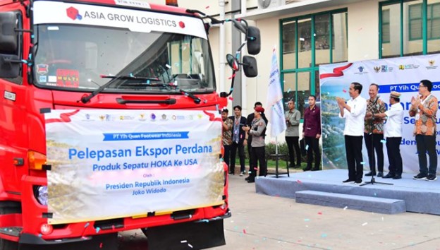 “Hari ini kita akan melepas ekspor perdana 16 ribu pasang sepatu merk Hoka ke Amerika yang diproduksi oleh perusahaan Yih Quan Footwear Indonesia, salah satu produsen alas kaki terkemuka asal Taiwan,” ujar Jokowi dalam siaran pers Istana Kepresidenan.