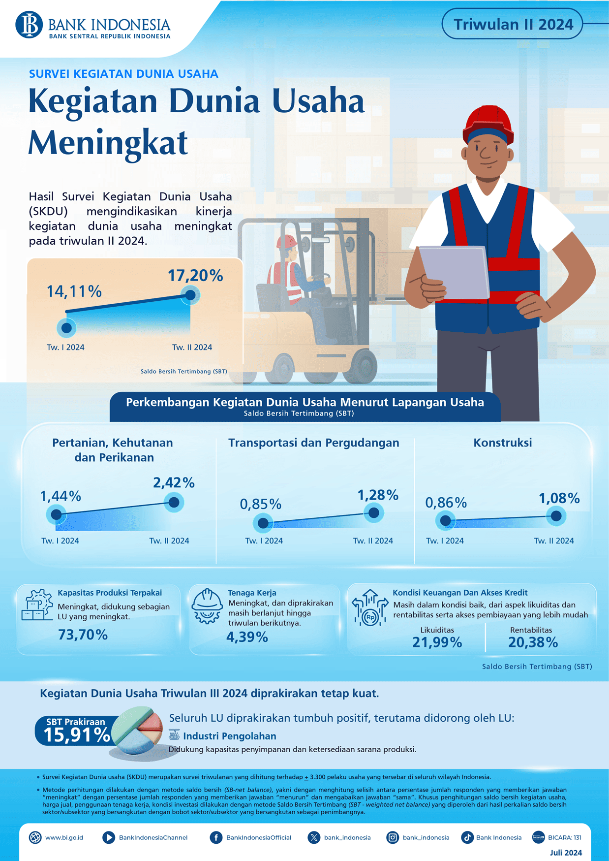 BANK Indonesia (BI) melakukan Survei Kegiatan Dunia Usaha (SKDU) untuk triwulan II 2024. Hasil survei mengindikasikan kinerja kegiatan dunia usaha meningkat pada triwulan tersebut.