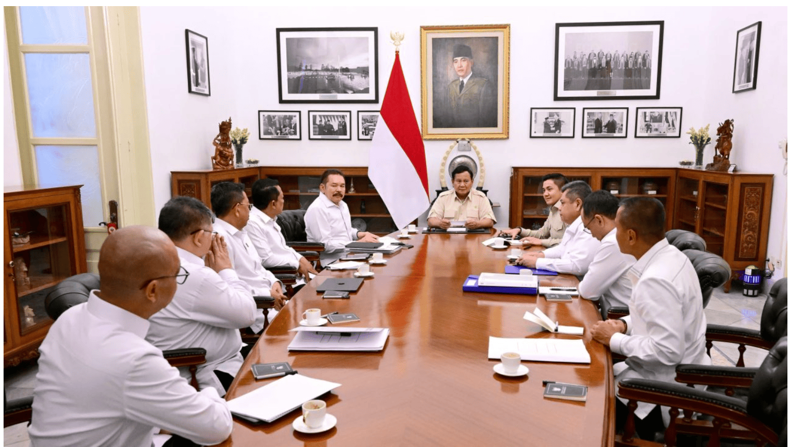 Turut mendampingi Presiden Prabowo dalam pertemuan tersebut adalah Sekretaris Kabinet Teddy Indra Wijaya. Tampak pula Kepala Pusat Pelaporan dan Analisis Transaksi Keuangan (PPATK) Ivan Yustiavandana serta Kepala Badan Pengawasan Keuangan dan Pembangunan (BPKP) Yusuf Ateh turut serta dalam pertemuan tersebut. (SG-1)