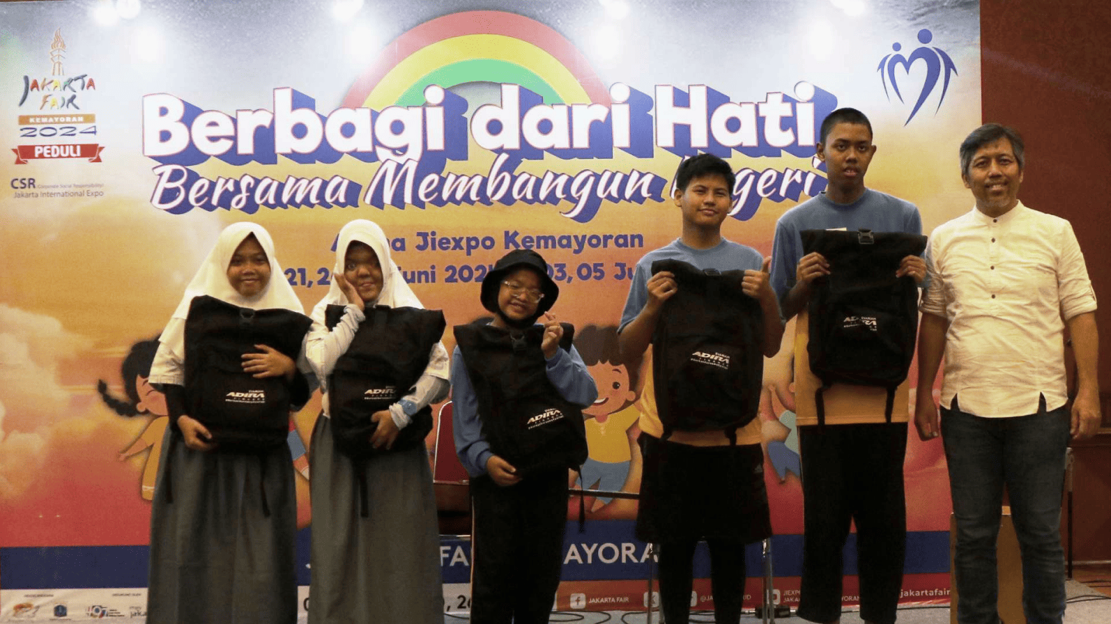 TURUT berpartisipasi pada kegiatan Corporate Social Responsibility (CSR) Jakarta Fair Kemayoran (JFK) 2024 PEDULI, PT Adira Dinamika Multi Finance, Tbk. (Adira Finance) melalui Unit Usaha Syariah memberikan bantuan 1.000 tas dan peralatan sekolah untuk anak-anak yatim piatu, berkebutuhan khusus, dan kaum dhuafa dari beberapa yayasan panti asuhan di Area Jabodetabek.
