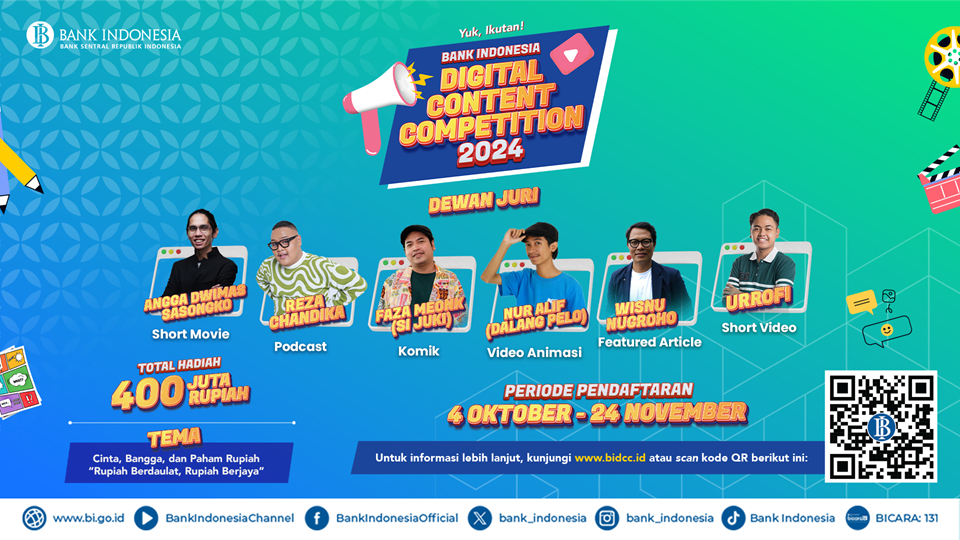 UNTUK mengajak generasi muda agar semakin mencintai dan bangga terhadap rupiah, Bank Indonesia (BI) kembali menggelar kompetisi seru ‘BI Digital Content Competition 2024’.