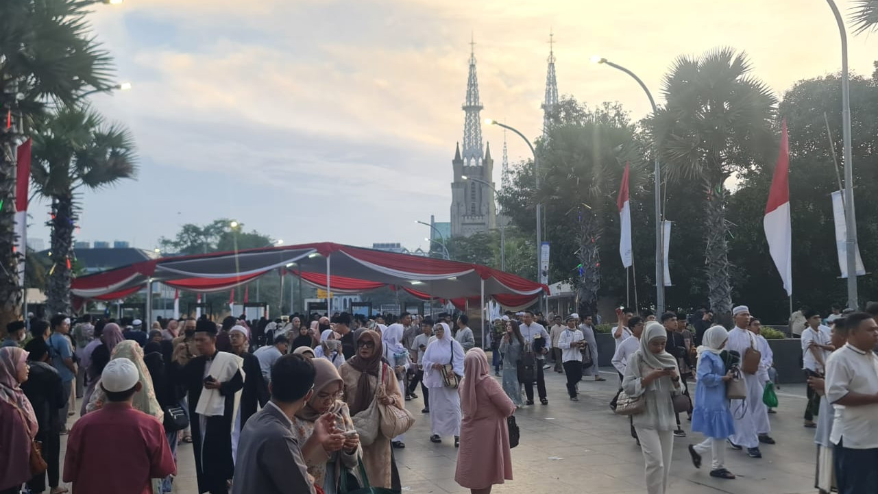 MASJID Istiqlal mulai dipadati umat Islam yang akan melaksanakan salat Idulfitri 1445 Hijriah sejak pukul 05.30 WIB. Sampai pukul 06.45, ribuan umat masih berduyun-duyun memasuki masjid dari pintu Al-Fattah.