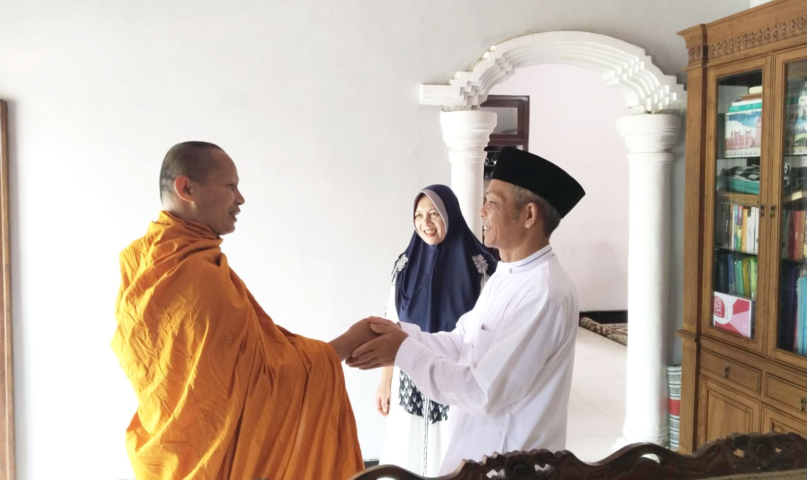 Di sela keramaian, tampak tokoh agama Buddha Bhante Thitasaddho yang secara langsung berkunjung ke rumah warga muslim. Bhante berbaur dan ikut mengucapkan selamat Idulfitri kepada umat muslim yang baru salat.