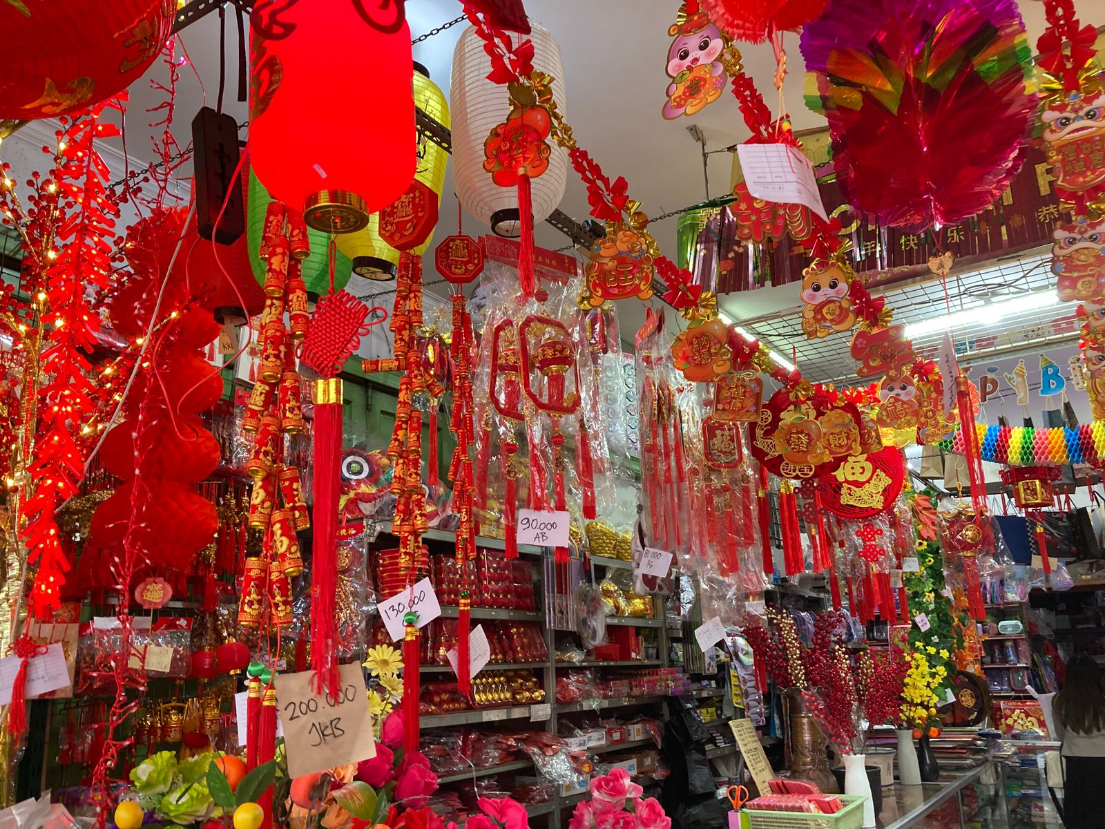 Beragam hiasan tersedia, mulai dari lampion merah, amplop angpao, hiasan kaligrafi "Fu," ornamen shio, hingga replika koin keberuntungan dan pohon Meihua.