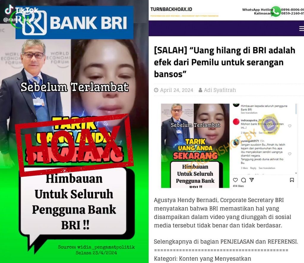Selain itu, akun sosial media (Instagram, Tiktok, Facebook) Rama News (@ramanews) pada 23 April 2024 juga mengunggah sebuah video yang terklarifikasi hoaks yang diambil dari akun TikTok widia_pengamatpolitik dengan narasi bahwa adanya kejadian nasabah BRI yang kehilangan uang merupakan efek dari pemilu untuk serangan bansos.