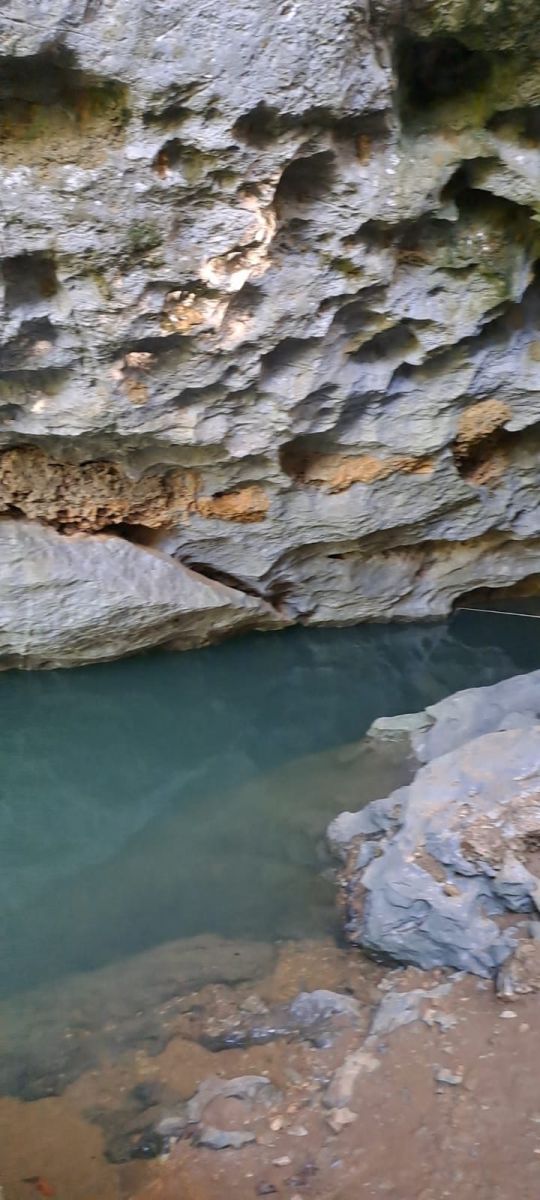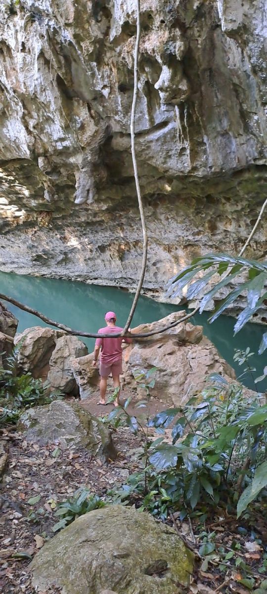 Namun begitu sampai di lokasi, semua rasa lelah langsung sirna. Di hadapan mata terbentang tebing batu alami setinggi hampir 10 meter, berdiri gagah mengapit aliran sungai jernih berwarna hijau kebiruan.