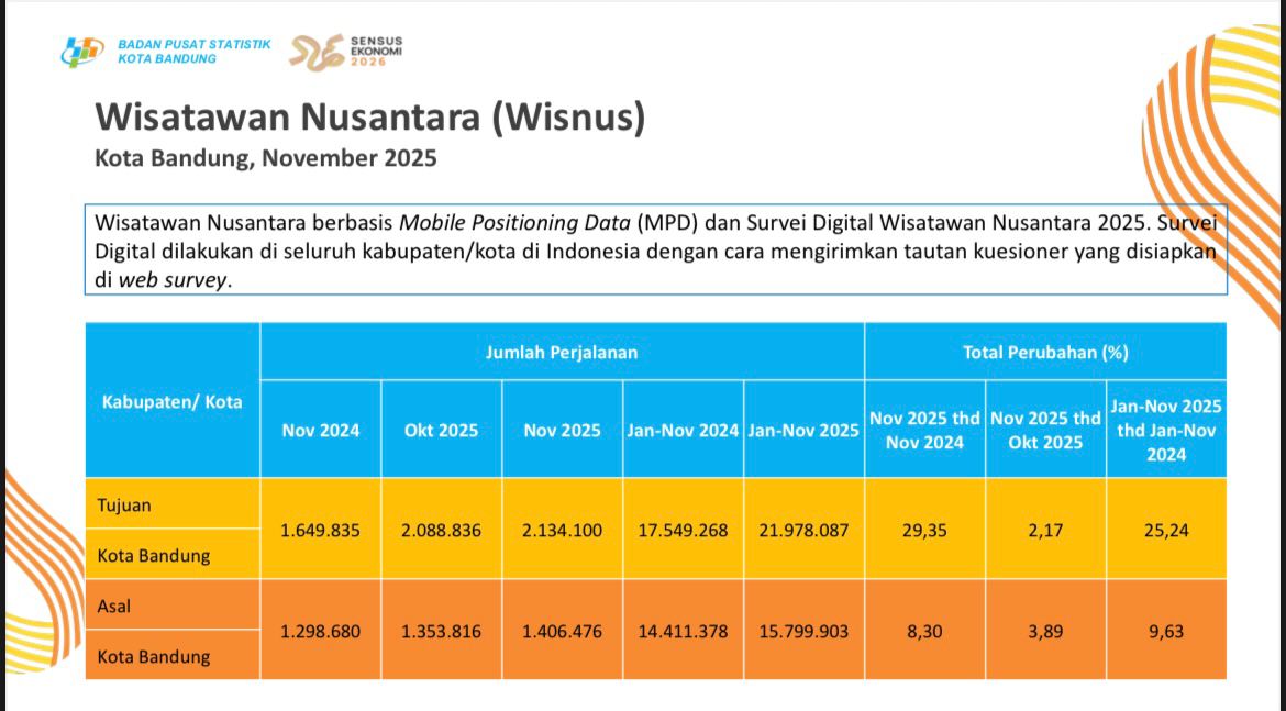 Kinerja pariwisata juga tercermin dari meningkatnya kunjungan wisatawan nusantara (wisnus). Selama periode Januari–November 2025, jumlah perjalanan wisnus ke Kota Bandung mencapai 21,97 juta perjalanan, atau meningkat 25,24% dibandingkan periode yang sama pada 2024.