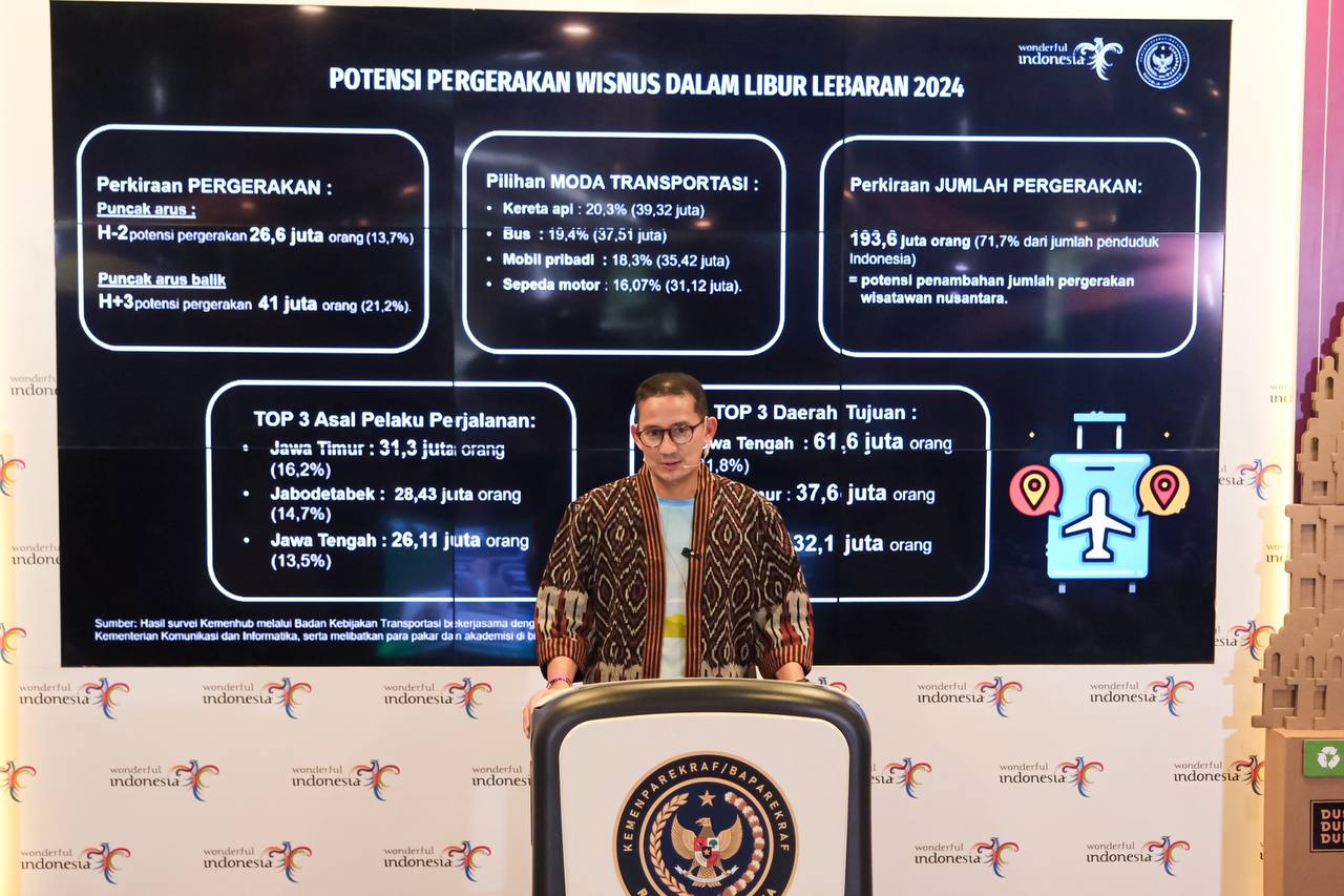 Sandiaga juga mengungkapkan pergerakan masyarakat secara nasional atau wisatawan Nusantara selama libur Lebaran tahun ini berpotensi mencapai 71,7% dari jumlah penduduk Indonesia atau sebesar 193,6 juta orang.