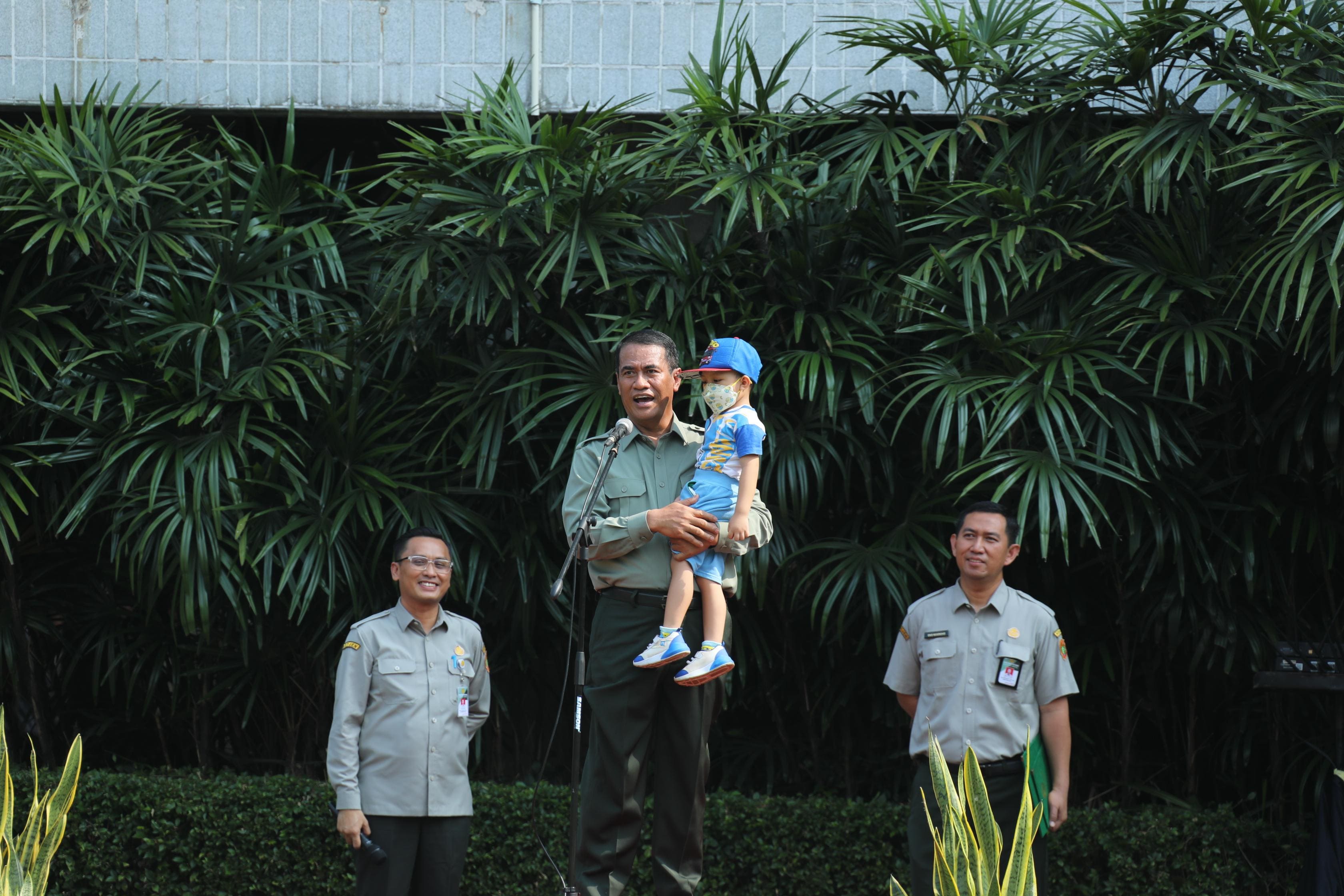 Di tengah kerumunan barisan, tampak seorang anak kecil berbaju biru dengan topi warna senada berjalan ke podium, dituntun oleh kerabatnya yang bekerja di Kementan dan mengaku sebagai bibi sang anak.