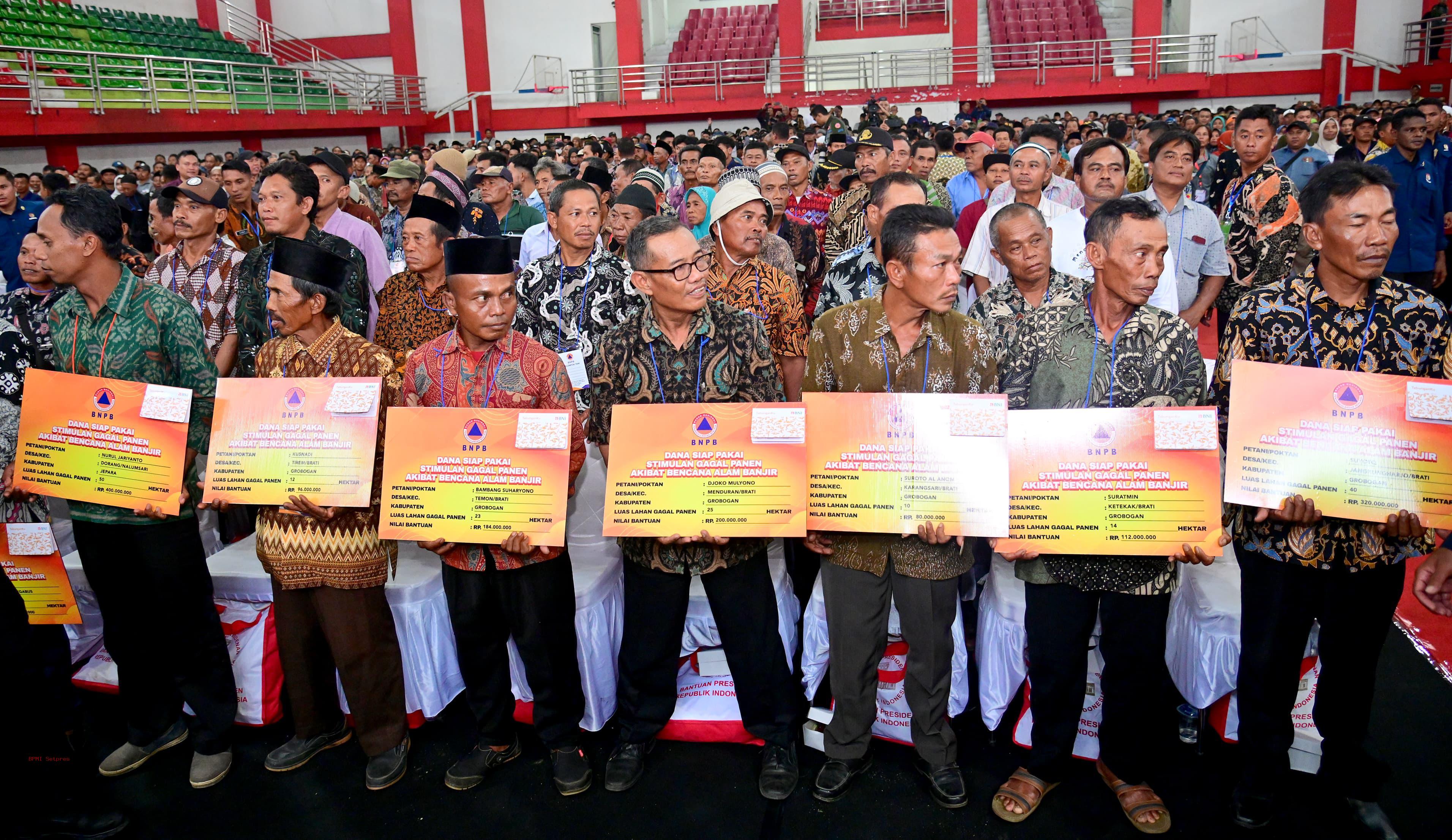PETANI gagal panen (puso) mendapat bantuan stimulan dari Presiden Joko Widodo (Jokowi) di GOR Bung Karno, Kabupaten Grobogan, Provinsi Jawa Tengah, Selasa, (23/1). Presiden berharap uang bantuan tersebut dapat segera diterima oleh para petani sehingga bisa segera menanam padi.